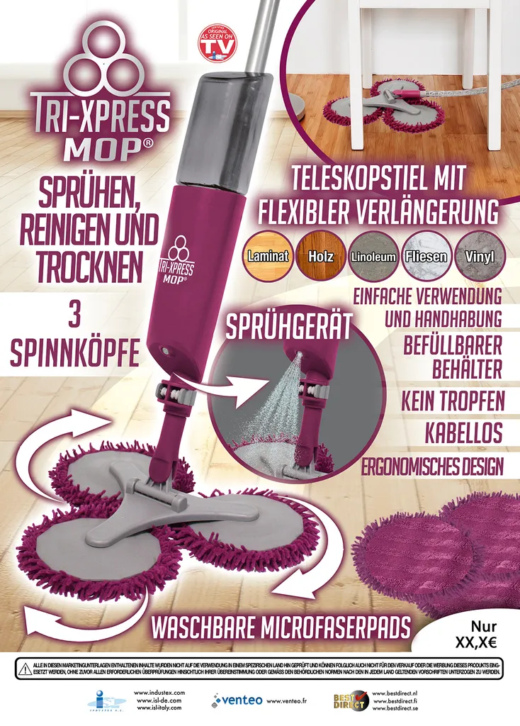 ISL GmbH Best Direct® Sprühwischer »Tri Xpress Mop®« 3-in1 Bodenwischer Mit Flexiblem Arm, 0,5 Liter Wassertank