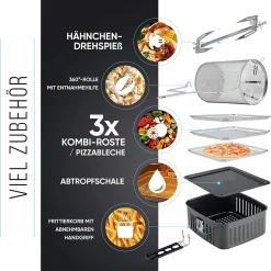 Black & Decker Black+Decker BXAFO1200E Minibackofen Heißluftfritteuse Zwei Röste, Fettauffangschalen, Griff, Frittierkorb, 360° Drehspieß