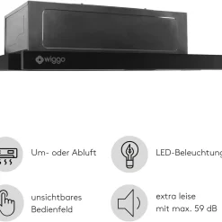 Wiggo Dunstabzugshaube 60cm WE-632ER Schwarz I Flachschirmhaube Für Abluft Oder Umluft Dunstabzug 300m³/h Mit LED-Beleuchtung I Einbau-Dunstabzugshaube Inkl. Fettfilter & 2× Kohlefilter