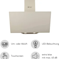 Wiggo Dunstabzugshaube 60cm Kopffrei I Abluft Umluft Dunstabzug 300m³/h – LED Touch-Display 3 Stufen I Schräghaube Inkl. Fettfilter & 2x Kohlefilter I Abzugshaube Mit Glasfront Creme