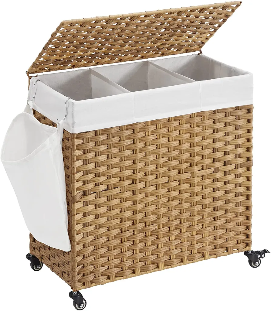 SONGMICS Wäschekorb, Handgeflochten, Wäschesammler, 140 L, Aus Polyrattan, Mit 3 Fächern, Herausnehmbare Tasche, Deckel, Griffe, Für Wohnzimmer, Badezimmer, 66 X 33 X 60 Cm, Naturfarben LCB363N01